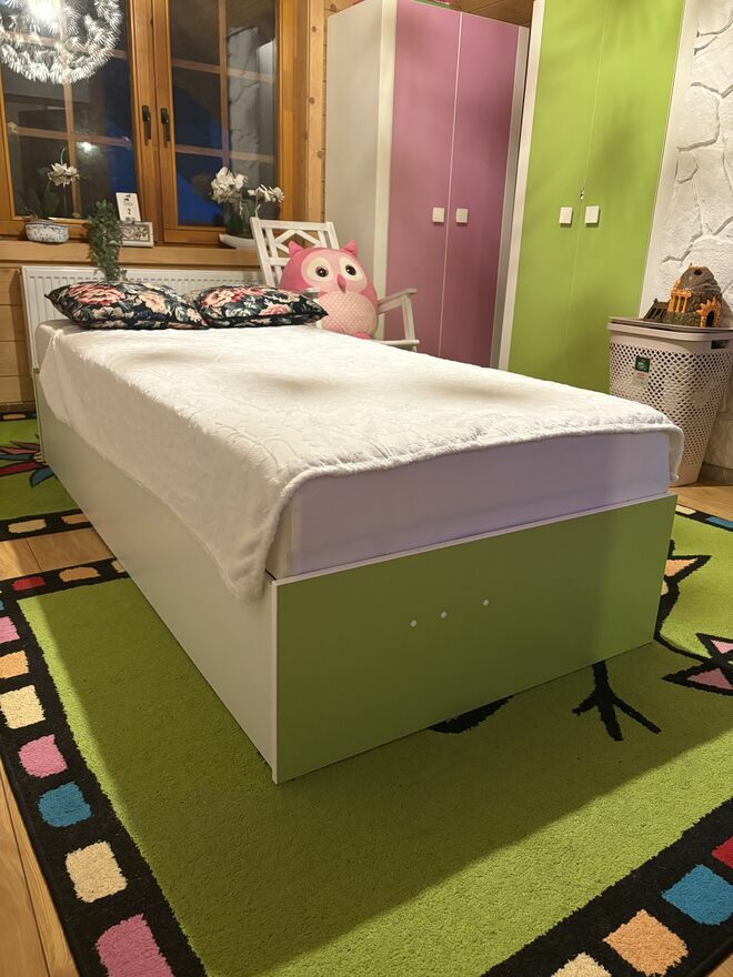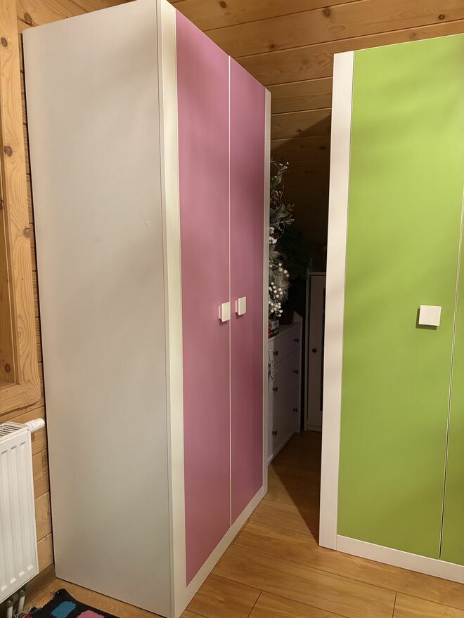 Dwie szafy dla dzieci w kolorze zieleni i różu do tego dwie komody z czterema pojemnymi szufladami w tych samych kolorach oraz łóżka jednoosobowe szerokość 90 cm z otwieranym do góry materacem i obszernym schowkiem na pościel do tego pod każdym z łóżek trzy regały na zabawki lub kosze na liczne drobiazgi. Stan ogólnie bardzo dobry. Jest możliwość pomocy w wniesieniu i ewentualnym montażu . Każdy za 100 zł w zestawie będzie zniżka .Sprawdź zainteresowanie tym ogłoszeniem